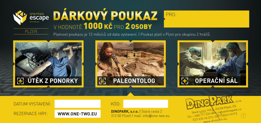 Dárkový poukaz pro únikové hry One Two v Plzni pro 2 osoby. Dárkový poukaz je otevřený pro všechny hry a jeho platnost je 12 měsíců. Konkrétní hru si vybere obdarovaný až při rezervaci. Termín a konkrétní únikovou hru si vybere obdarovaný sám dle libosti a sám provede rezervaci prostřednictvím rezervačního formuláře na tomto webu. Rezervaci hry lze uskutečnit bez čísla poukazu. Čísla vstupenek a poukazů se nemusí při rezervaci vyplňovat, stačí přinést poukaz s sebou.